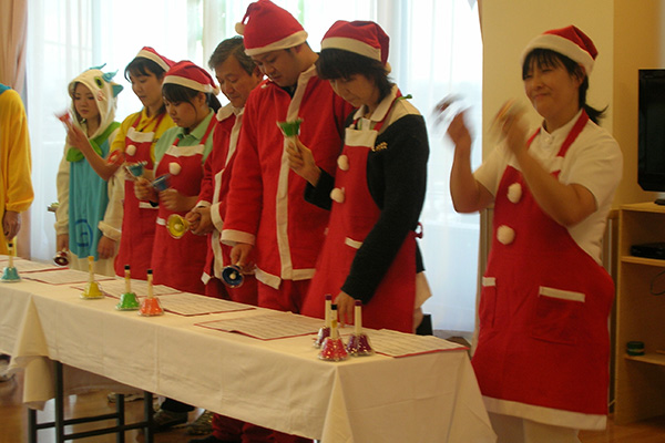 職員によるハンドベルや劇などの催し物が行われます。サンタに扮した施設長が、ご利用者様にクリスマスプレゼントをお渡し、毎年楽しいクリスマス会となっています。