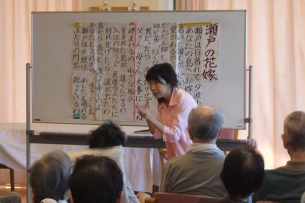 季節に合った童謡唱歌や歌謡曲などの懐かしい歌の数々を電子ピアノの弾き語りに合わせて、ご利用者様と一緒に歌っています。歌体操もあり、昔話などの紙芝居もありといった、思い出を蘇らせて頂く心和むひとときとなっています。